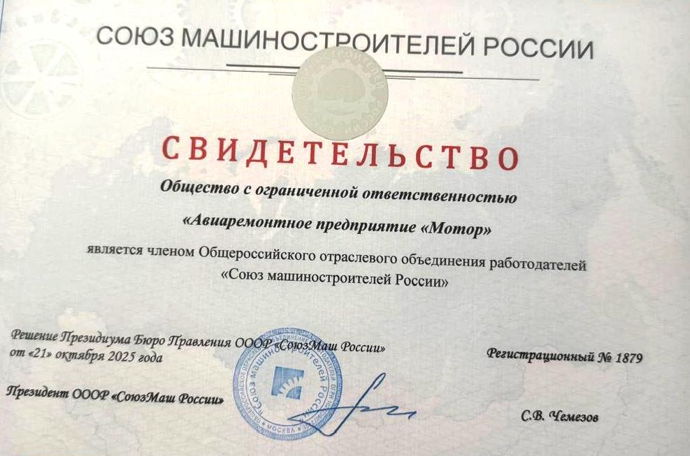 Вручили свидетельство машиностроителей России Обществу с Ограниченной ответственностью "Мотор" о том, что данное уникальное авиаремонтное предприятие является членом Общероссийского отраслевого объединения работодателей "Союз машиностроителей России".