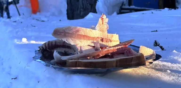 После помывки – ужин, предлагающий соблазнительные блюда северной кухни, приготовленные своими руками. Роль шеф-повара при этом великолепно исполнил Юрий Тютрин. Команда с аппетитом полакомилась свежеприготовленной ухой, ароматным, приготовленным на открытом воздухе шашлыком, исконным лакомством северян - свежеструганной строганиной.
