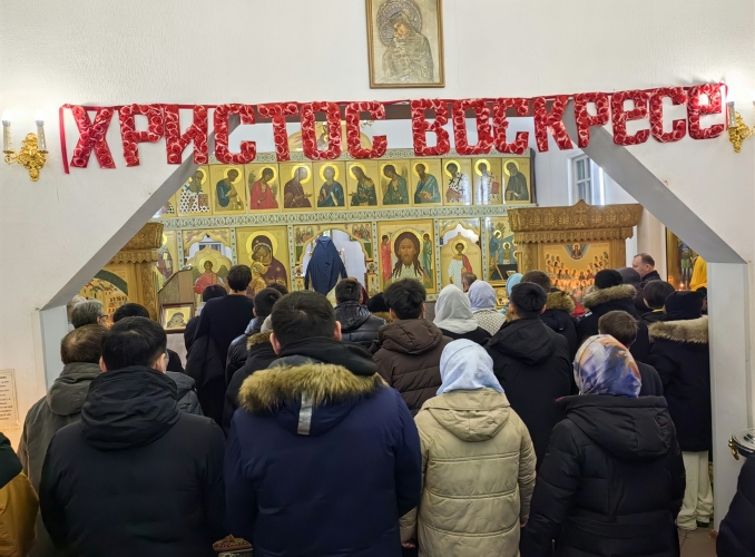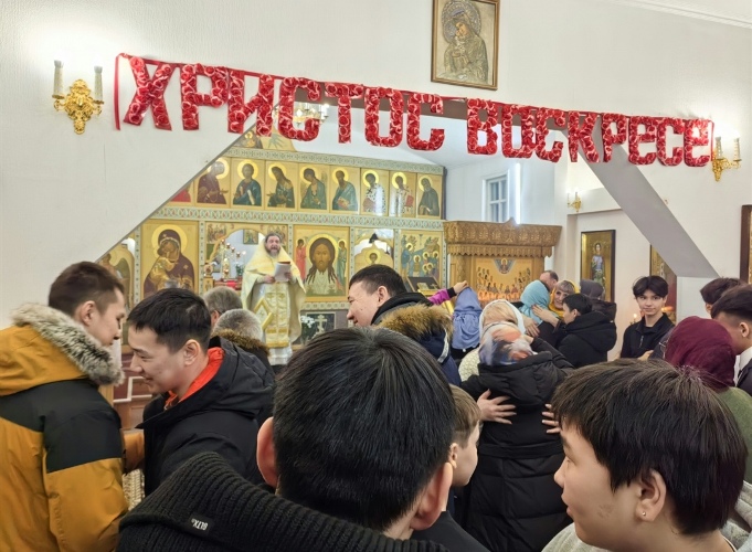 Во время торжественного Богослужения после молитвы и совершения Крестного хода настоятель Свято-Богоявленского храма отец Евфимий торжественно произнес долгожданные слова: «Христос воскресе!». И, как своеобразный пароль, не менее торжественно прозвучал единогласный ответ прихожан: «Воистину воскресе!»